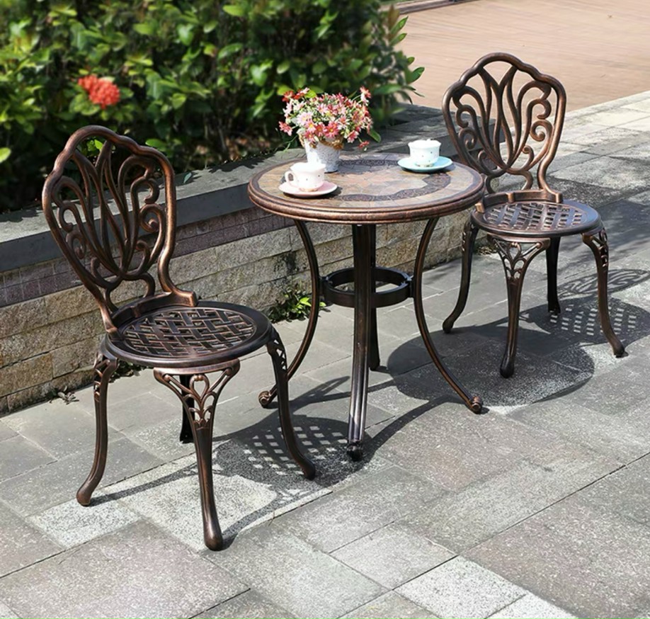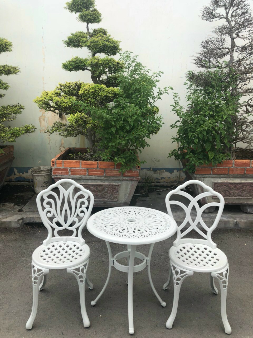 Không những vậy phần chân liền với ghế và lưng ghế được thiết kế hoa văn rất độc đáo. Chân ghế cong nhẹ tạo nét mềm mại. Chiếc bàn cũng được thiết kế vô cùng đơn giản với mặt bàn hoa văn và 4 chân cong. Đặc điểm này cũng hạn chế tối đa lượng nước đọng lại trên bề mặt giúp nâng cao tuổi thọ cho sản phẩm. Ngoài ra với gam màu nâu đồng mang đến cho không gian của bạn sự hoài cổ độc đáo. Màu trắng thể hiện nét trang nhã hiếm có .