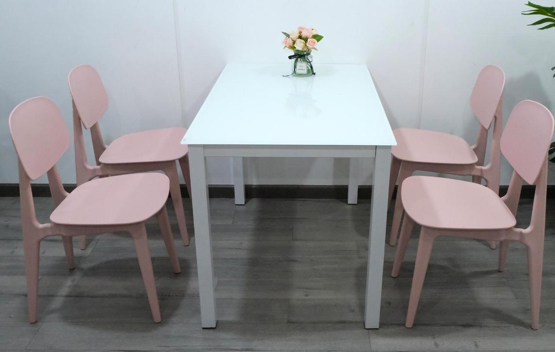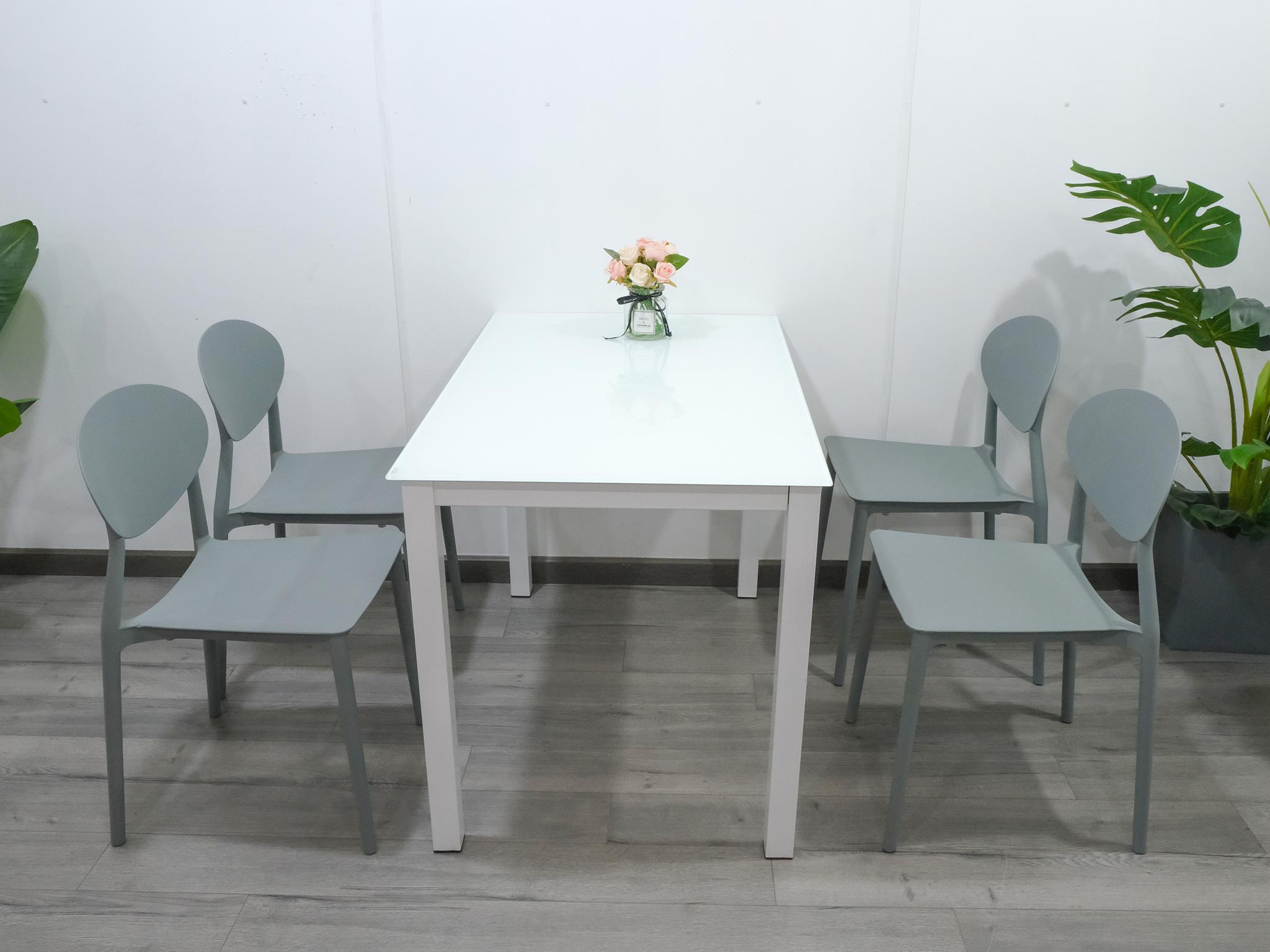 Combo bàn ghế ăn 4 người và ghế nhựa cao cấp KG - T156-4 bộ bàn ăn đơn giản cho căn hộ hay nhà phố với bàn kích thước 70x110cm tiêu chuẩn cho bàn ăn 4 người mặt bàn màu trắng kính cường lực kết hợp với chân sắt sơn tĩnh điện với 4 ghế nhựa cao cấp. Combo 5 sản phẩm gồm 4 ghế và 1 bàn tiết kiệm hơn so với mua lẻ rất nhiều.
