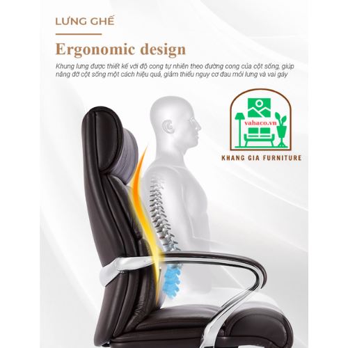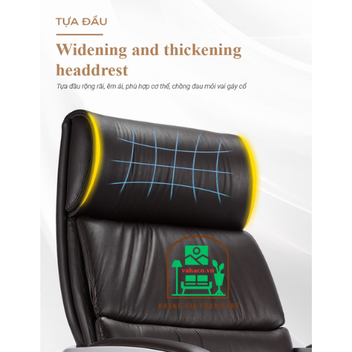 Thiết kế ghế lưng cao. Tựa đầu dày bằng mousse đúc cao cấp giúp nâng đỡ phần cổ tạo cảm giác thoải mái và giảm đau mỏi khi ngồi làm việc trong thời gian lâu dài
