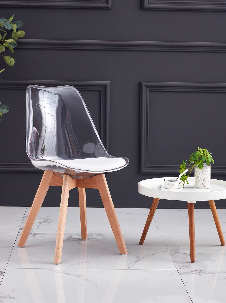 Chất liệu: Nhựa PP trong suốt, Nệm bọc da PU, Chân gỗ sồi