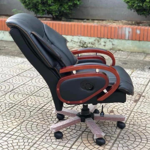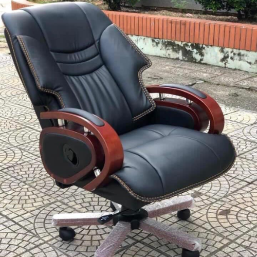 Thiết kế sang trọng: Ghế được thiết kế với phần lưng cao và đệm ngồi dày dặn, mang lại vẻ bề thế và quyền lực cho người sử dụng. Các đường may tinh xảo cùng với chi tiết gỗ tự nhiên ốp hai bên tay vịn và chân ghế, tạo điểm nhấn ấn tượng cho không gian làm việc.