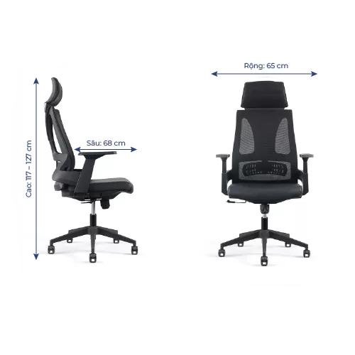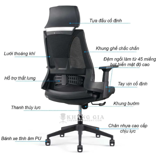 - Lưng ghế được làm từ lưới cao cấp, thoáng khí, co giãn tốt, mang lại cảm giác êm ái và dễ chịu.