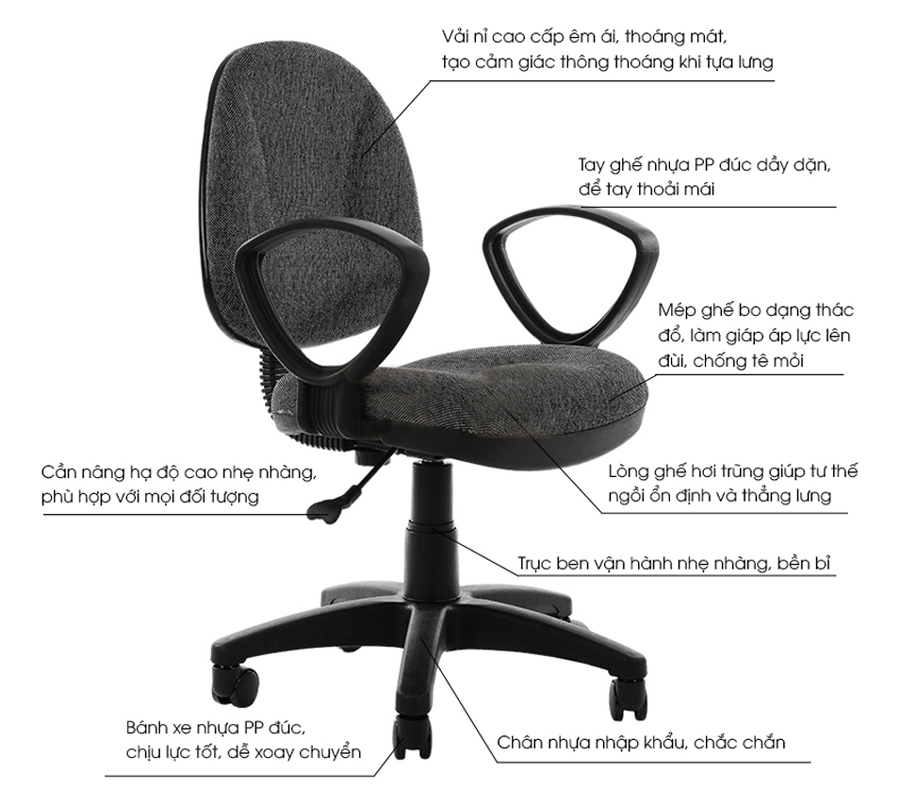 Ghế xoay văn phòng giá rẻ có lưng ghế cùng mặt ghế bọc bằng đệm mút bọc vải nỉ đem đến cảm giác êm ái. Ghế có tay vịn và chân làm từ chất liệu nhựa cao cấp.