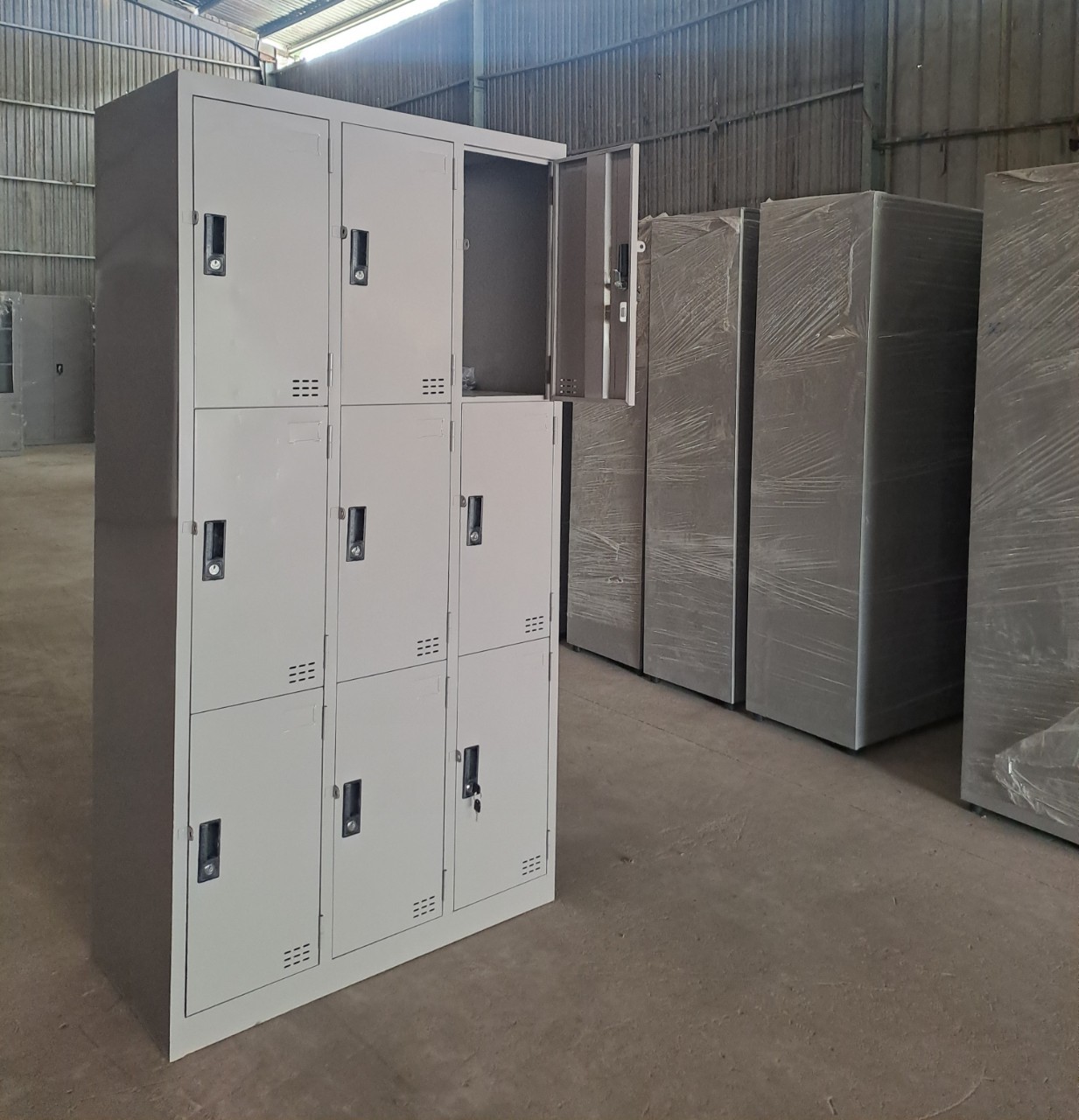 Tủ có 1 khối gồm có 9 ngăn đều nhau, cánh sắt mở sử dụng khóa locker, núm tay nắm và có thêm tai khóa móc, trên mỗi cánh cửa được dập 1 bảng tên nhân viên và 1 lỗ thông gió