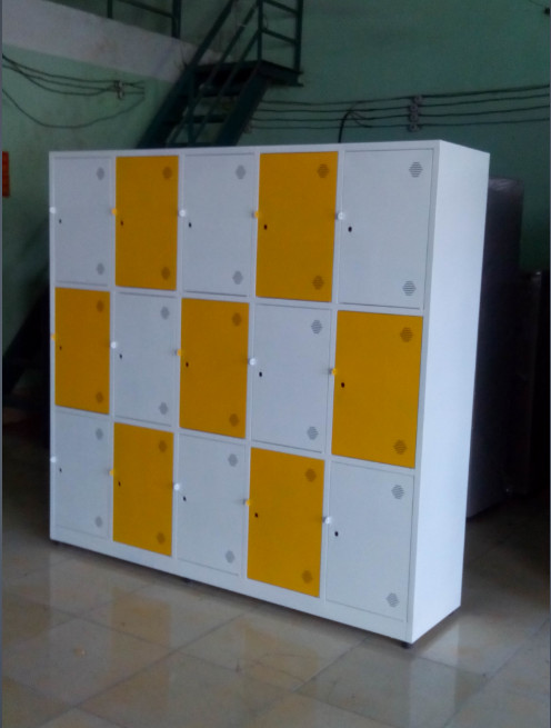 - Là loại tủ đặt chủng 15 ngăn cánh mở, trên mỗi cánh có khóa locker, tai móc khóa, lỗ thông gió và dập bảng tên nhân viên.